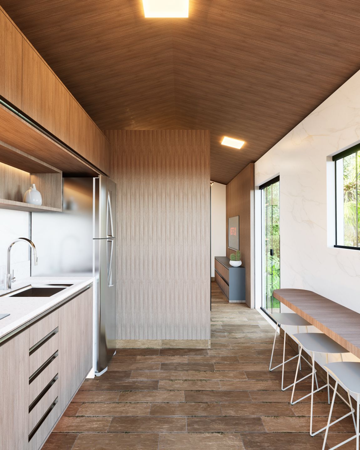 Com um deck frontal de 1 metro, este modelo oferece amplitude e uma sensação de liberdade única. É o ambiente perfeito para receber amigos, contemplar a paisagem e transformar cada pôr do sol em um momento especial. Mais do que uma tiny house, é um convite ao lazer e à contemplação, sem abrir mão da eficiência e sustentabilidade ECO LIVING HOUSE.